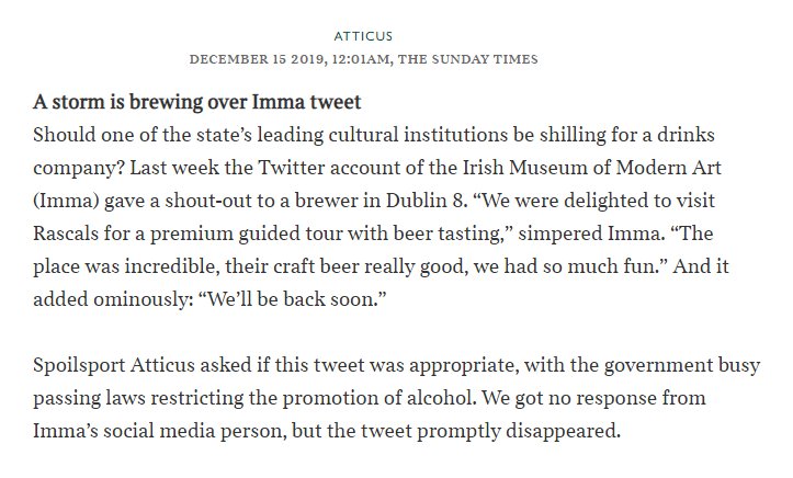So opened a section of the Atticus column in The Sunday Times of 15th December 2019. It had been prompted by a tweet from the Irish Museum of Modern Art, celebrating a co-operative venture among companies and organisations in Dublin 8. IMMA staff were expressing their delight at visiting the nearby taproom of Rascals Brewery. "We had so much fun", they said, according to Atticus.